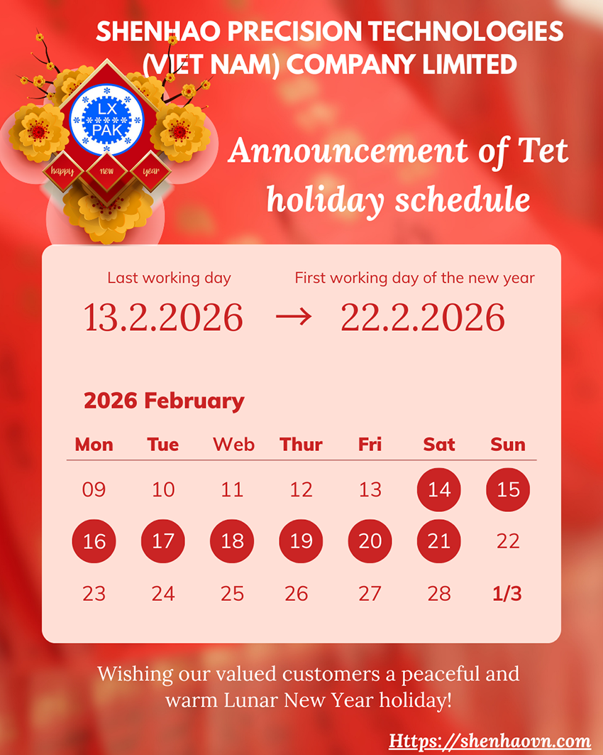 Announcement of Lunar New Year holiday schedule Thu 29/01/2026 CÔNG TY TNHH CÔNG NGHỆ CHÍNH XÁC SHENHAO VIỆT NAM Search news News category Featured news Announcement of Lunar New Year holiday schedule SHENHAO VIETNAM - HOLIDAY ANNOUNCEMENT TO CELEBRATE VIETNAM NATIONAL DAY 2/9 SHENHAO VIET NAM honored in the top 10 FDI enterprises with strong development in 2025 4N3Đ Đảo ngọc Phú Quốc cùng Shenhao Việt Nam Shenhao Việt Nam mừng quốc tế phụ nữ 8/3/2025 Related news Announcement of Lunar New Year holiday schedule SHENHAO VIETNAM - HOLIDAY ANNOUNCEMENT TO CELEBRATE VIETNAM NATIONAL DAY 2/9 SHENHAO VIET NAM honored in the top 10 FDI enterprises with strong development in 2025 Write your comment Send